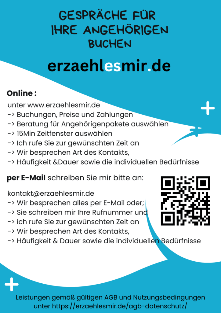 - Wertvolle Ergänzung: Gespräche durch Dritte sind keine Konkurrenz zum Familienkontakt, sondern eine sinnvolle Ergänzung – sie geben Angehörigen die Freiheit, Besuche wieder mit mehr Leichtigkeit und Freude zu gestalten.